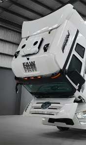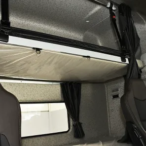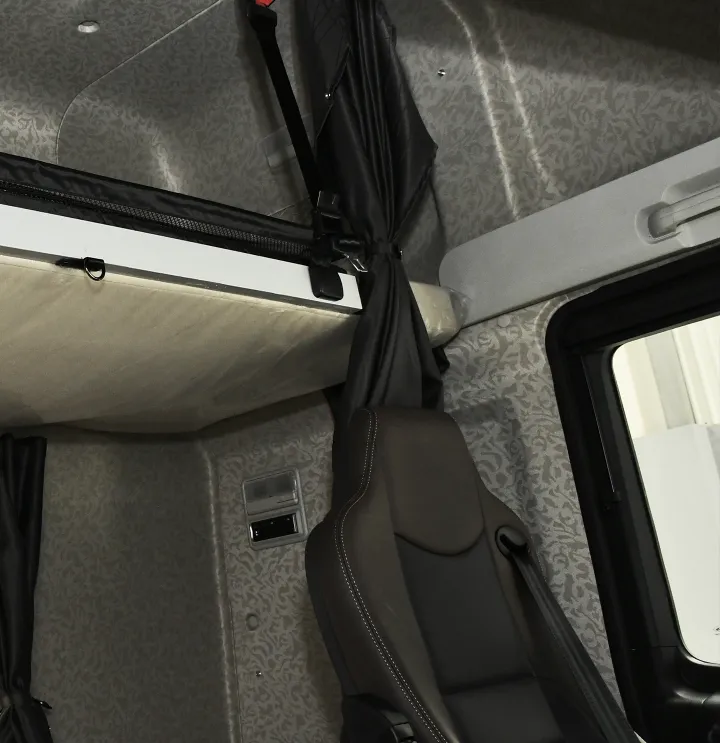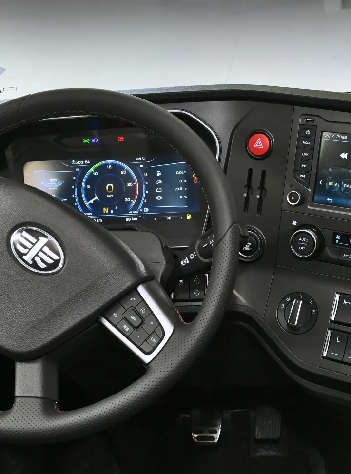 Sistema WABCO de doble circuito con discos en todas las ruedas. ABS, AEBS, ESC, EBS, freno de motor, freno de escape, retardador hidráulico de 5 pasos, control crucero adaptativo (ACC), alerta de impacto frontal (FCW), alerta de abandono de carril (LDN), cámaras de punto ciego laterales, sistema autónomo de frenado de emergencia, diferencial autobloqueante.